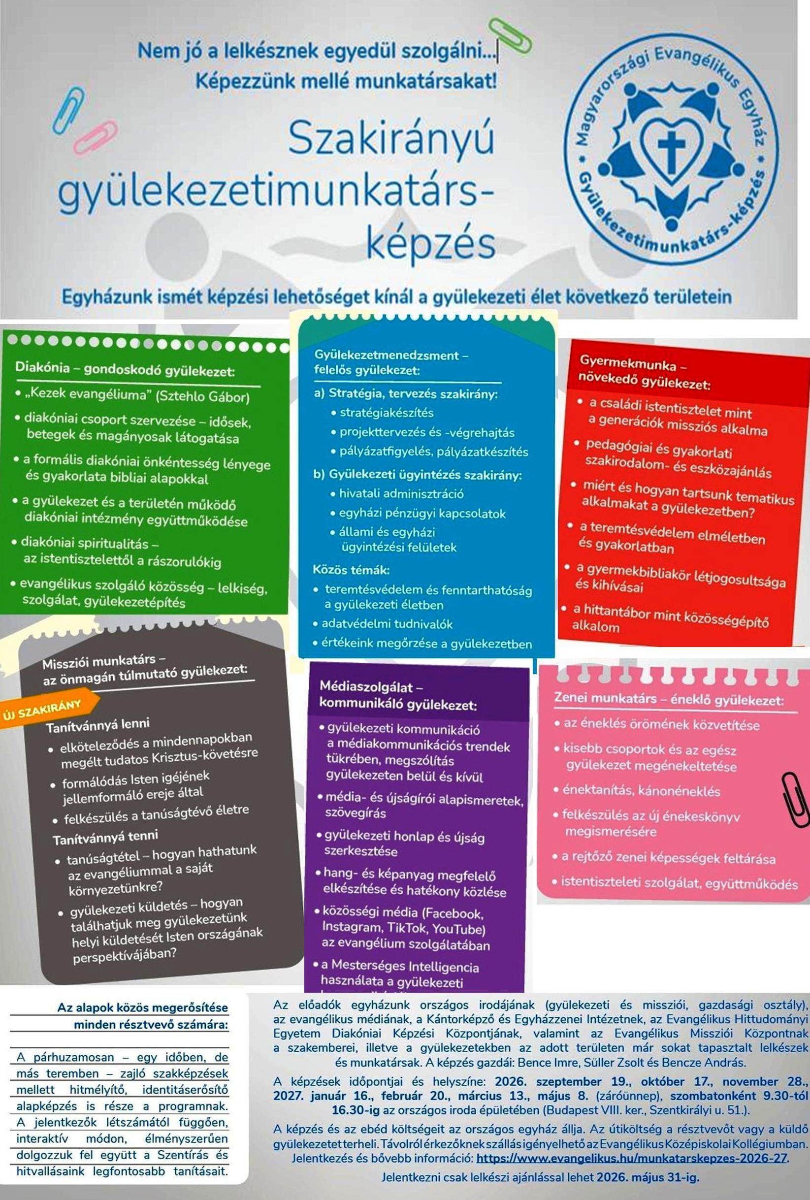 Egyházunk ismét képzési lehetőséget kínál a gyülekezeti élet következő területein: